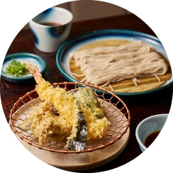 天然大海老をはじめとする五種の天ぷらと、香り豊かなせいろうどんを組み合わせたセット。カラッと揚げたての天ぷらの香ばしさと、冷たいせいろの清涼感が重なり合う、食べ応えのある一膳です。